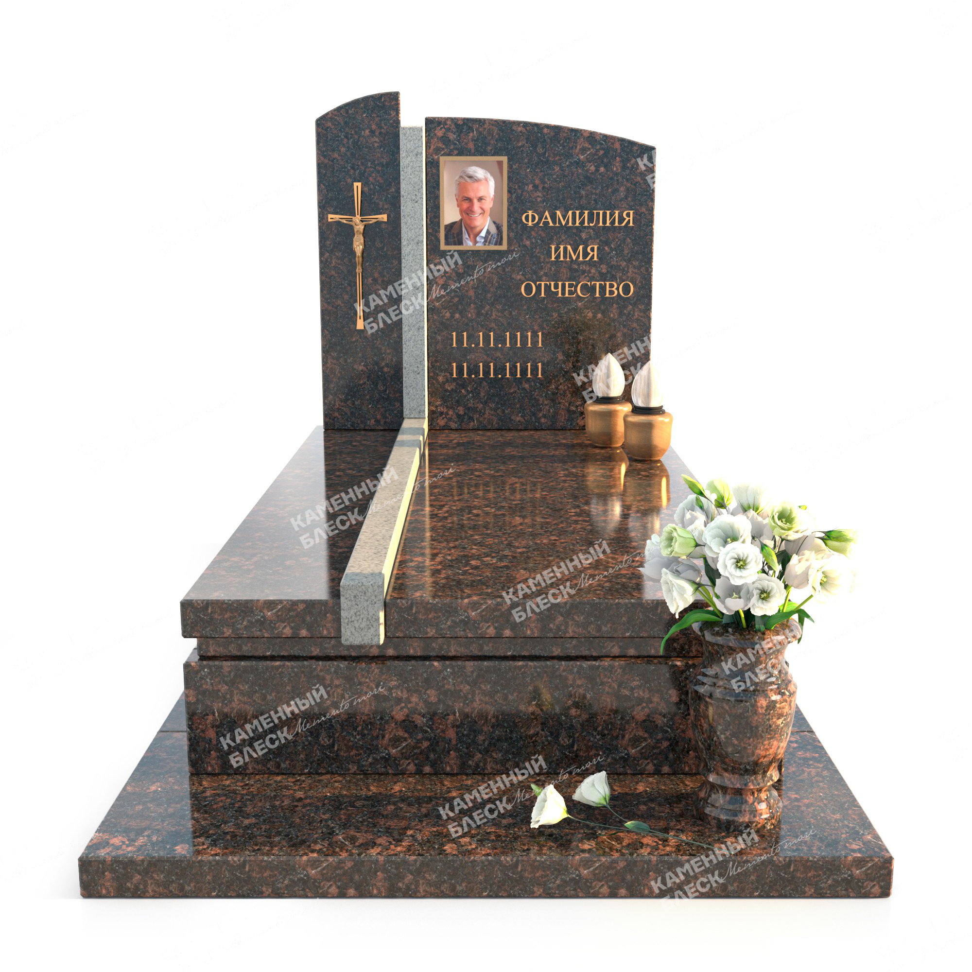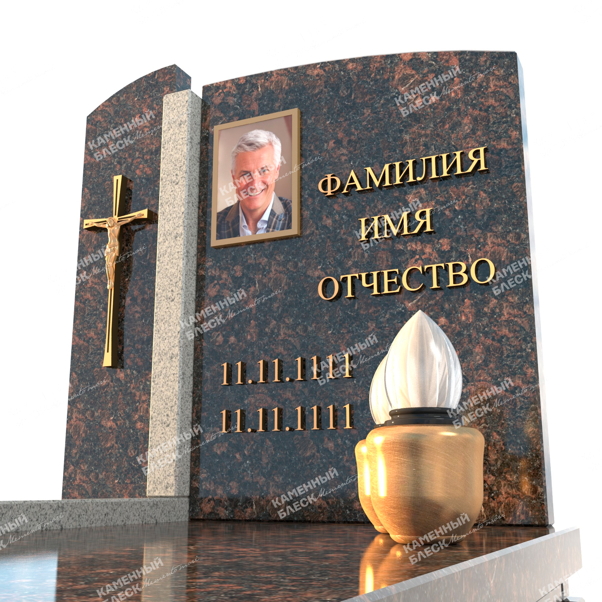 Эксклюзивный памятник Европейского типа. Композиция выполнена в сочетании двух цветов гранита Балтийский и Мансуровский. Стеклянный медальон выделен бронзовой рамкой, а информация об усопшем и эпитафия нанесены с помощью накладных элементов caggiati, которые подчеркивают чувство стиля.На левой стеле наложен бронзовый крест caggiati, который подчеркивает отношение усопшего к вере. Европейские памятники отличаются высотой, они идут ниже привычных стандартных памятников. Модель памятника, возможно, дополнить элементами декора, такими как, ваза, лампада, скульптура и другое.