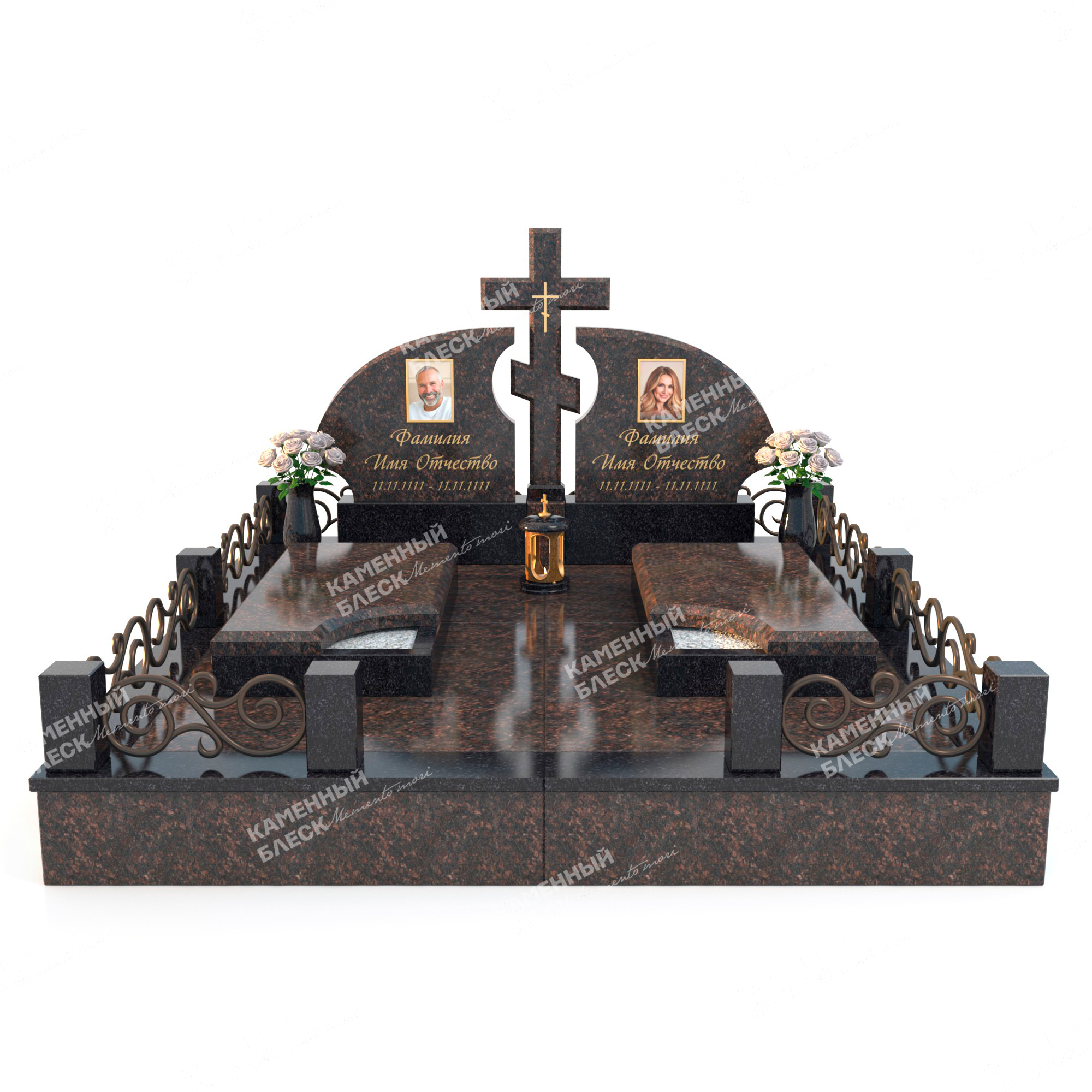 Плавный и лаконичный мемориальный комплекс ВИП класса для двойного захоронения. Всё выполнено из двух видов гранита. Две основные стелы служат для размещения информации об усопших, а центральный крест объединяет композицию и символизирует веру. Надгробные плиты закрытого типа выглядят красиво, монументально и очень удобны при уходе. Комбинированная ограда по периметру закрывает контур места захоронения. Кованные элементы монтируются в гранитные столбы. Для благоустройства выбрана гранитная плитка. Бетонное основание создаёт устойчивость и надёжность для памятника.